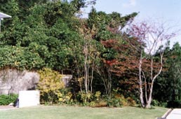 芝生スペース西側の中・高木は、落葉樹のヤマボウシ、シラキ、ウラジロノキ、ヤマモミジを植裁し、樹下は低木の常緑樹ハクサンボク、ツワブキ、ベニシダ、プリペットなど敷地全体で約50種類の植物を植栽 |