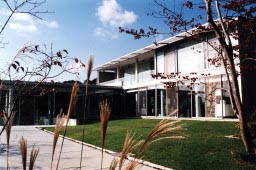 すすきやヤマボウシでシャープな建物を引きたてる |