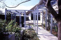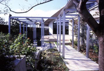 一見、スチールのパーゴラは、冷たくシャープなイメージを与えそうですが、ここでは階段状のステップ花壇とバーベキュー広場やテラスのやさしい質感の石貼り、そして周辺の園芸が、絶妙な雰囲気づくりの役割を果たし、やさししい空問となっている |