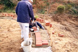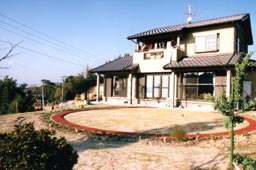 家の前の中央に円形状の芝生を敷きつめ、輪かくにそって花壇を配置