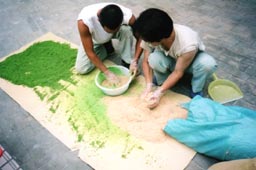 当初、生の苔を植えて欲しいと依頼されたが、通風、水やりなどの設備が十分でなく、フェイクによる緑化になった