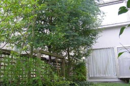 パーゴラを利用した支柱は、隣家との遮蔽を兼ね、雑木林風の植栽がやさしい