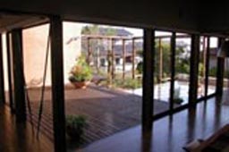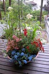 デッキの上に直径80cmの鉢に四季の草花の寄せ植えし、廊下からの眺望に花を添えている