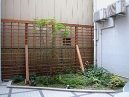 隣接地に木製格子を作り、奥に土を入れ、ツル植物で緑化壁をキャンバスとした前庭花壇計画