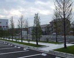 本館前から真っ直ぐ延びる駐車場、歩道、両脇のラクウショウは、移植痛みから回復したらすばらしい街路樹になる |