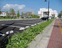 駐車場と歩道(町道)の間は、ランタナの白花を植栽。当地の暖かい気候での開花は長い |