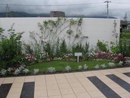 左側にも同じ花壇があるが、花色を白、紫などでまとめ、式に参列した人々を引き立てるよう工夫した