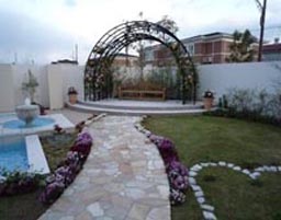 結婚式場として本館、中庭、駐車場などの機能がバランスよくスムーズにいかされるような造園計画をする