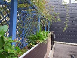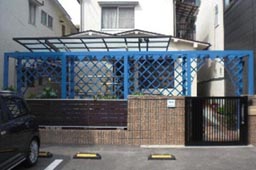 来訪者は、天気のよい日には、パーゴラと玄関前までの間のテーブル、イスのスペースで対応